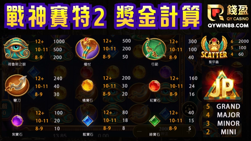 戰神賽特2覺醒之力老虎機獎金計算:(單次投注金額 ÷ 20) × 塞特符號賠率,就是你的單次獎金。